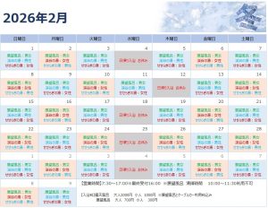 【日帰り入浴カレンダー】2月 日帰り入浴カレンダーとお知らせ